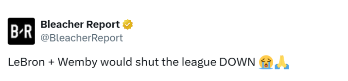 北京时间10月28日,知名美媒Bleacher Report更新社媒,写道:“詹姆斯和文班亚马这对组合能直接统治联盟啊!”他们认为马刺应该寻求交易詹姆斯,让这两位状元的联手。